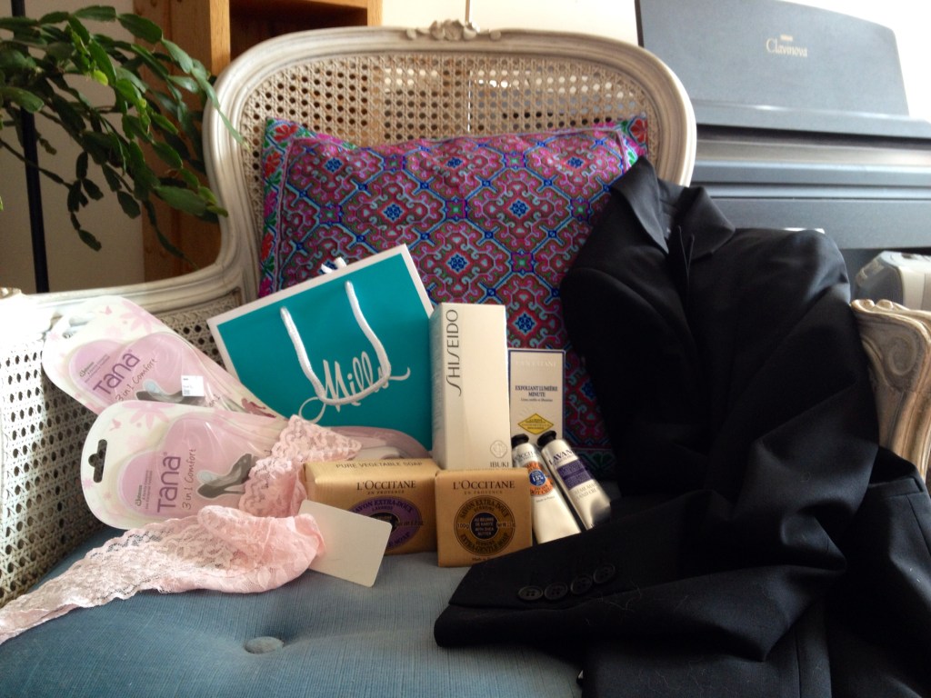 Back to my train wreck moment today. I knew I wanted to buy an investment piece today aka the fitted black blazer. I b-lined it to the Hugo Boss rack which had a black tuxedo blazer regular $950.00 50% off; straight away I said “NO!!!!”. I thought okay, well, looks like I will just browse and then I saw a classic fitted black blacker by a Canadian designer and MADE IN CANADA!!!! Say what? What a treat to find an article of clothing actually made in Canada. Size 8 and it fits! Price was high but not Hugo Boss high and 50% off; yep, mine. I still feel good about this purchase as it is a timeless piece and fits right in with building my five piece French wardrobe.