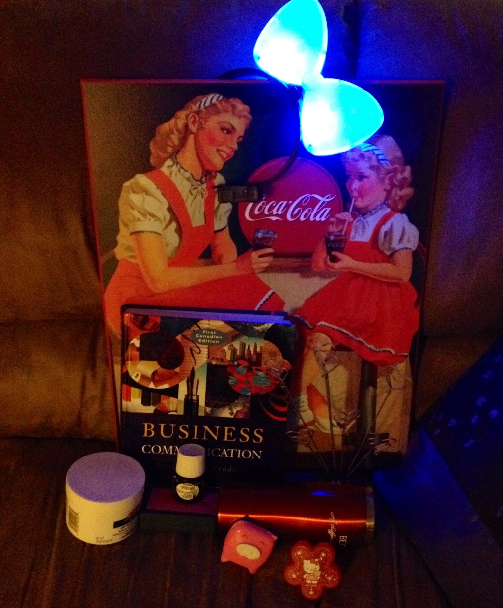 Today I am giving away a flashing lights plastic bow headband I wore in South Korea during the Lantern Festival, a vintage picture of a Coca Cola advertisement, a business communications book from my University days, a pink piggy contact lens container, a hello kitty pill box, a pink and blue hand painted box (another failed art project), a bottle of blue glass paint, container of Palmers moisturizer, a multiple picture holder thing and a coffee container which is a bit warped and missing its lid.