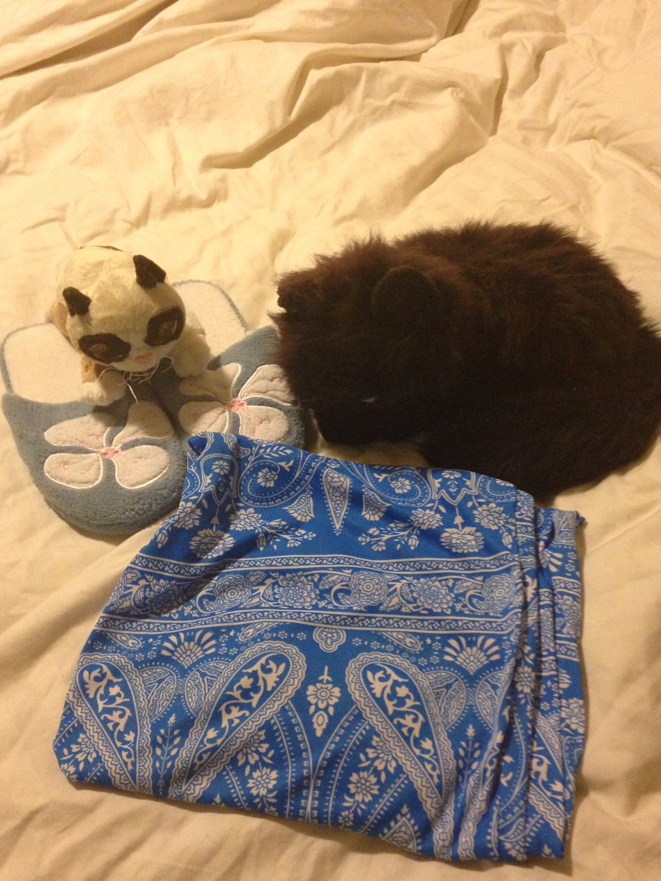 A pair of paisley pants I never wear, a grumpy cat stuffie, another stuffed animal cat and a pair of slippers. Adios useless stuff!