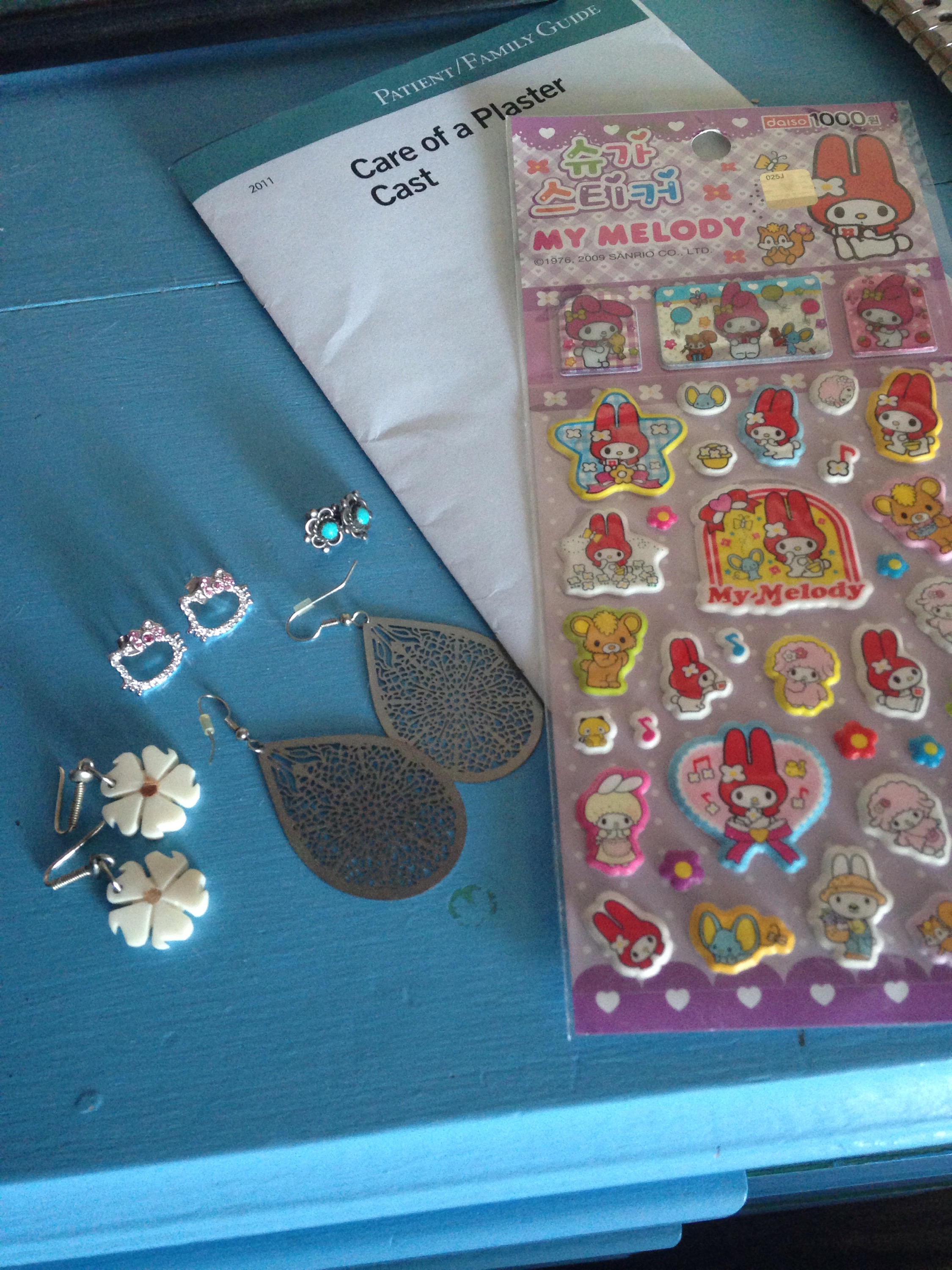 Four sets of earrings, instructions on cast care and a sheet of stickers. Not large items, but still “stuff” I have no use for so they shall be leaving the premise.