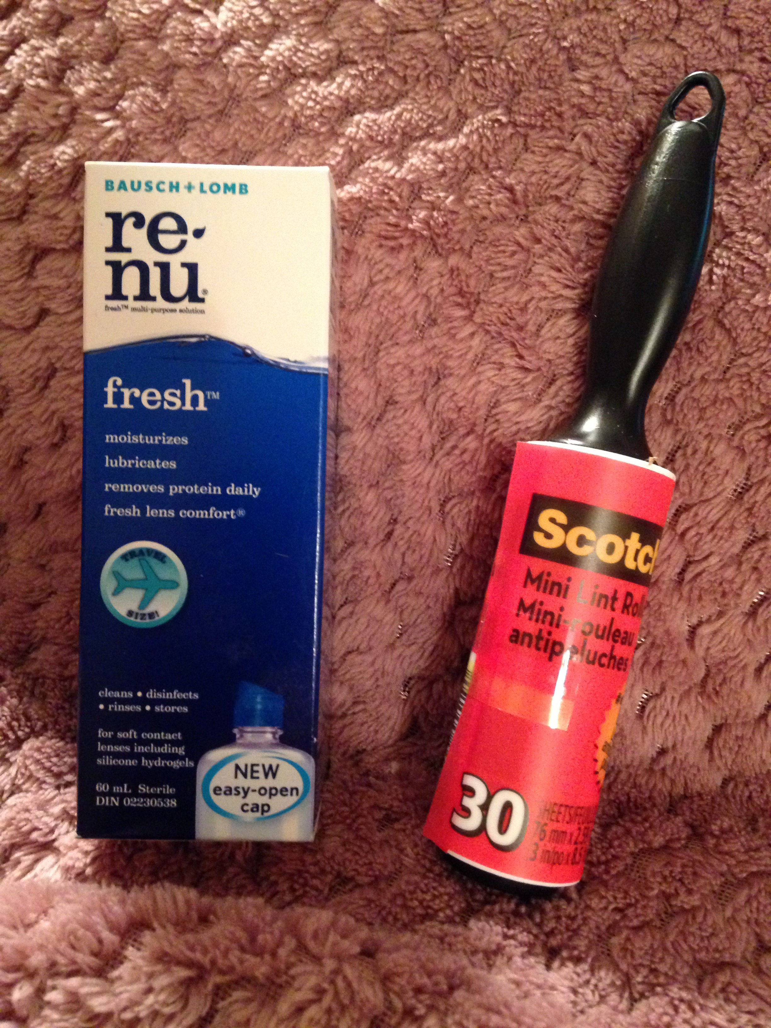 Travel size contact solution for my carry on and a mini lint brush as cat hair is generally a part of my life.