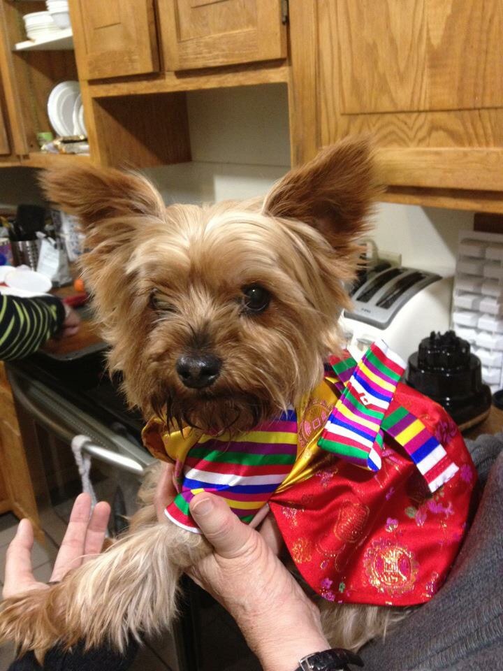 Above in the fall 2012, Pippa wearing a Hanbok I bought in South Korea…