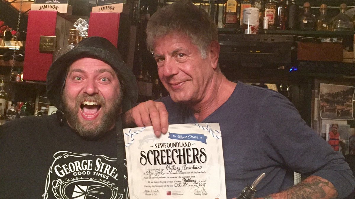 Above, Bourdain, being “Screeched” in Canada’s East Coast province Newfoundland on CNN’s Parts Unknown