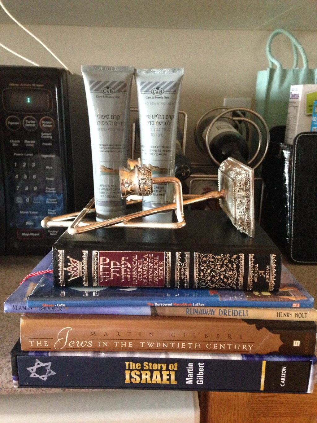 The nine items for the #minsgame are a book on Israel, a book on Jews in the 20th century, two children’s books on Chanukah, a prayer book I bought in Montreal, a Shabbat candle holder with the Star of David, a foot cream & a hand cream never opened from Israel (Dead Sea products) and a book mark.
