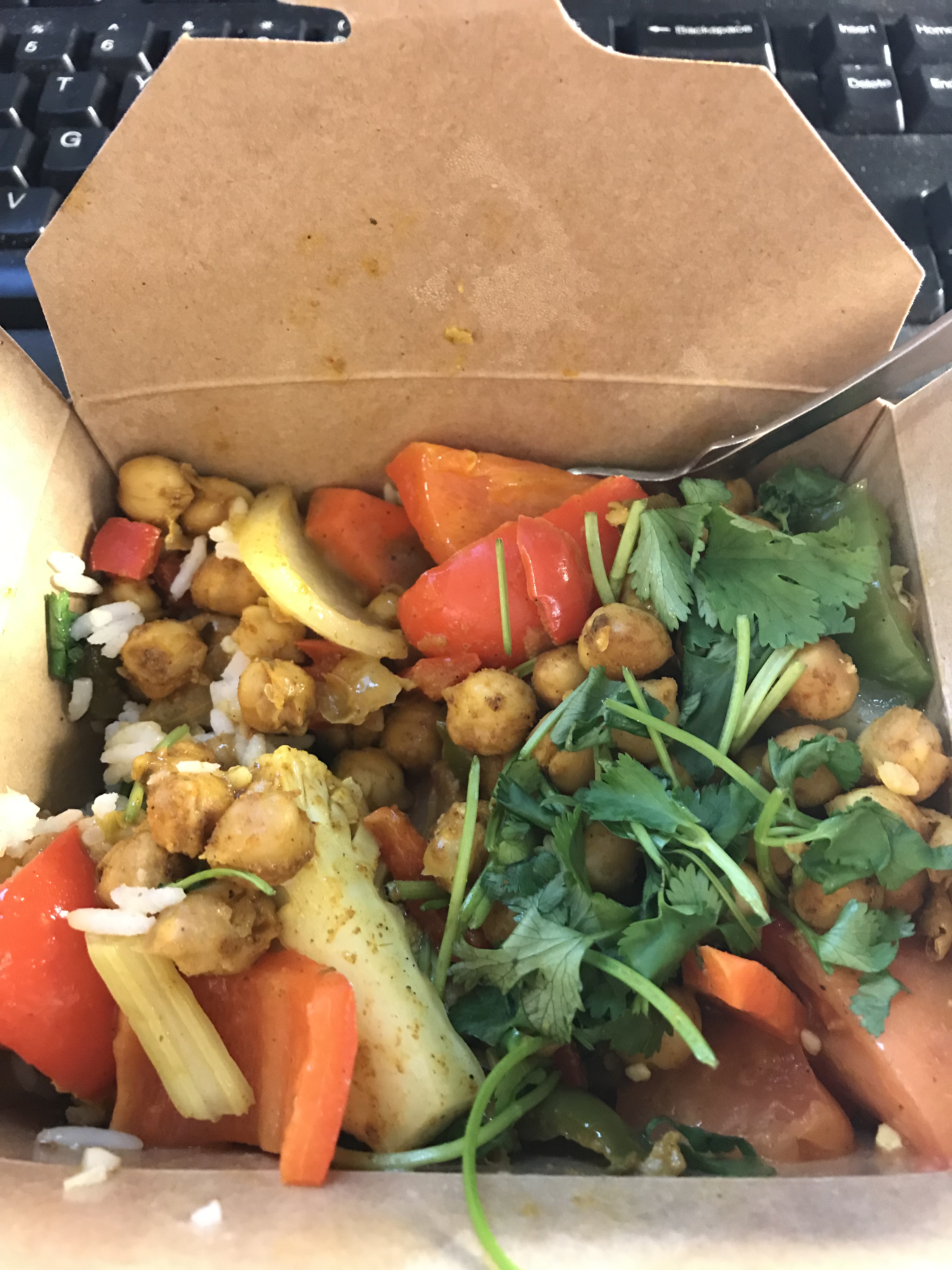 Above is one of my purchased lunches from my work’s cafeteria; it is a chickpea curry with lots of cilantro. At least I am making healthy choices right?