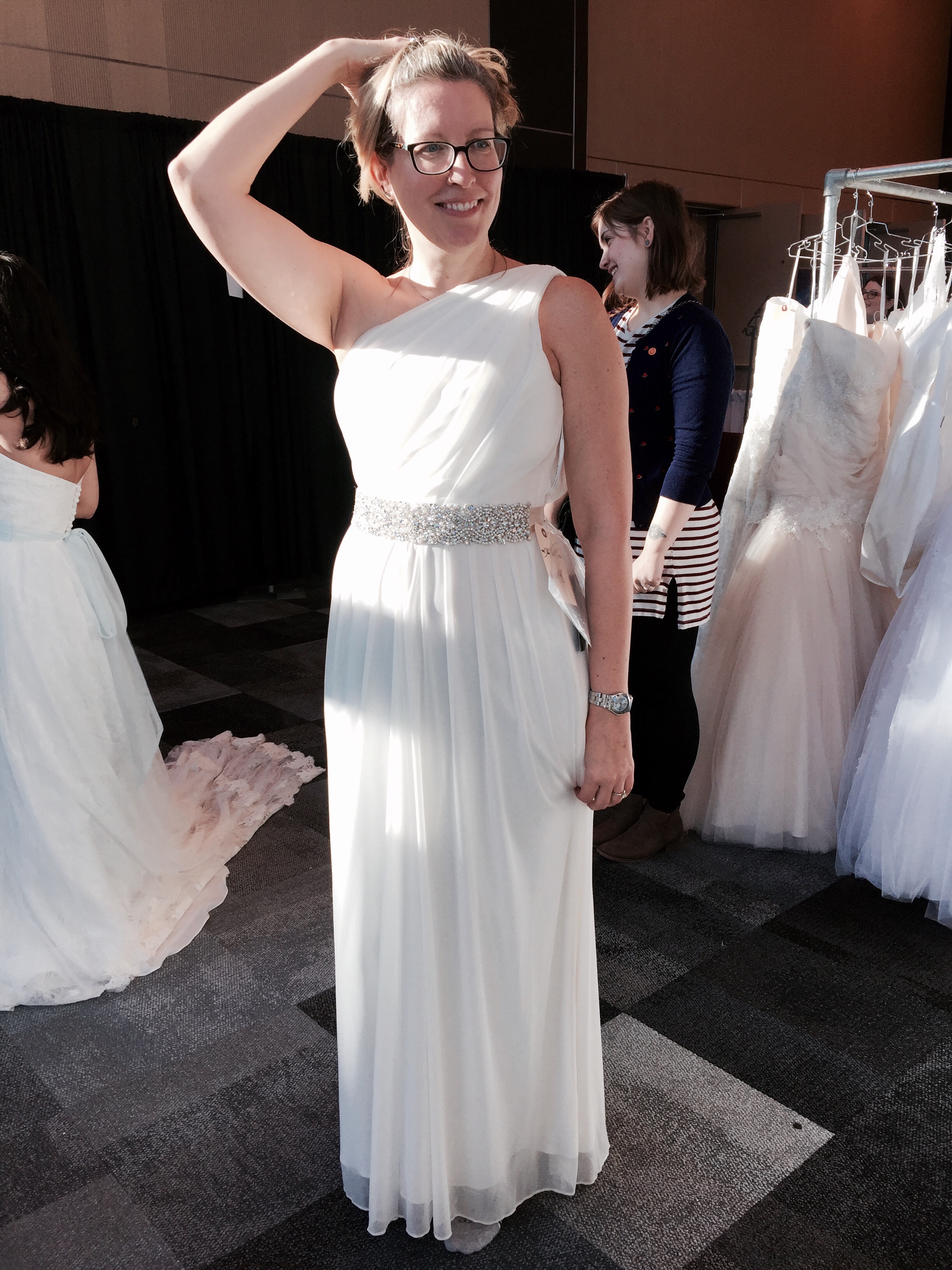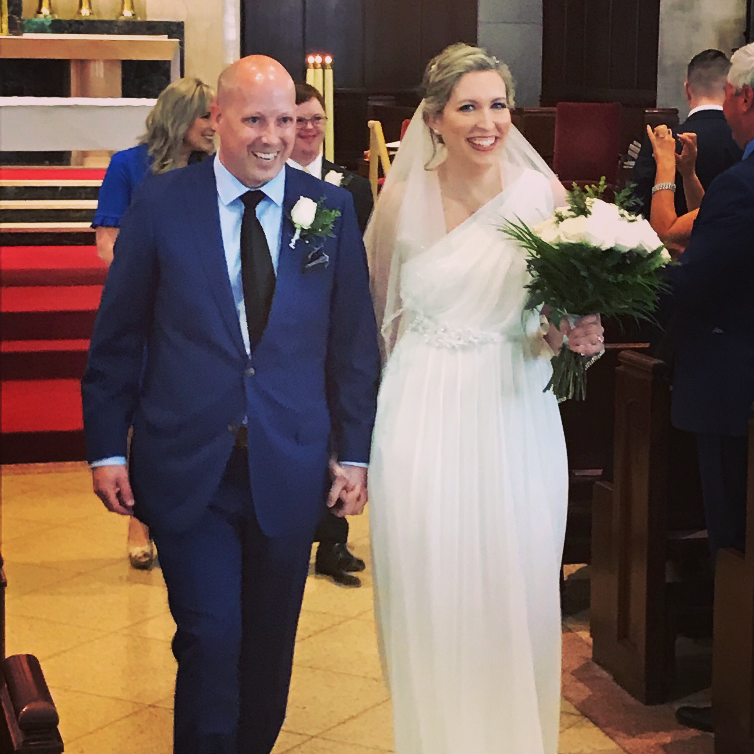 I found my dress in February 2018 at a Bridal Show on the clearance rack; it was a sample size marked down to $150 and it was perfect for me. It is the only dress I tried on, and I was a bit worried it would be too plain, but what I had visualized in my mind came to fruition the day of my wedding. To spruce up the dress and add some bling, I bought a wedding belt to tie around the waistline and this cost me $65 and it is literally a silky ribbon with some embroidered beads on it. Wedding stuff is pricey! My new sister in law leant me her tiara and veil from her wedding covering something borrowed and something old. For my something blue, I had navy blue velvet flats which I bought from a second hand shop called “Frenchy’s” and I am quite sure the shoes had never been worn before; I paid maybe $5 for them. I had my hair done which was around $100 and make up was around $130 including tip.