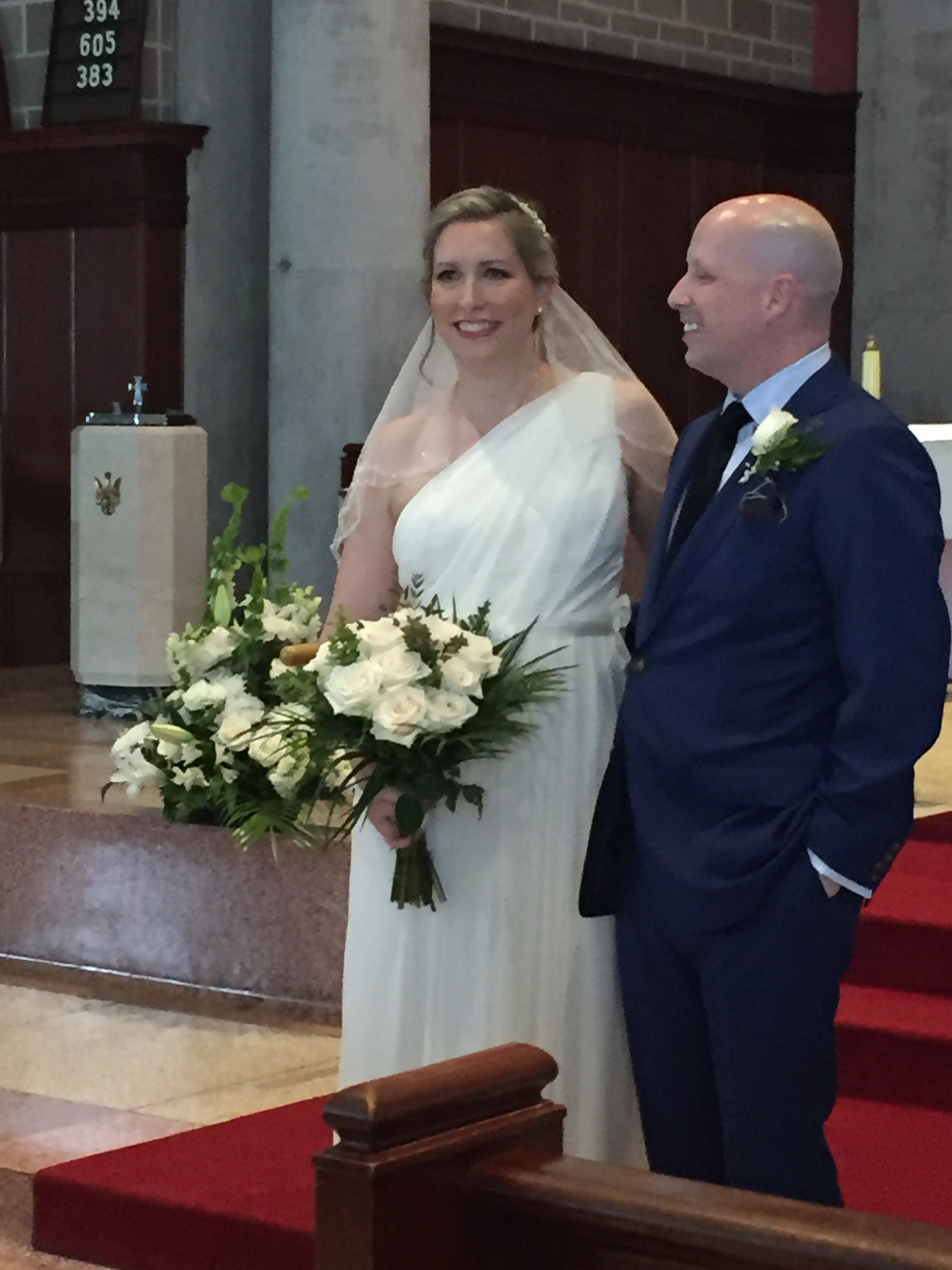 My bouquet was $100, three boutonnieres $30 and two large displays of white flowers $300 plus tax. Brian gave his Mom one of the displays after the reception, and I gave my Mom the other display, so it was a nice gift for the Bride & Groom’s Mamas. I did not have bridesmaids per se who walked down the aisle with me, but two of my friends stood with me whom I consider to be like family. I told them to wear whatever they wanted. Somehow they nicely coordinated their outfits by coincidence to the blue theme as Brian wore a dapper blue suit.