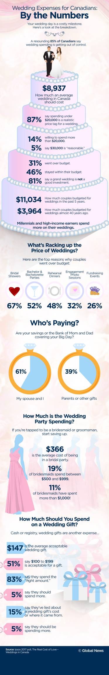Below is something I found online regarding Canada and how much it should cost and what most are willing to pay and who pays. Everyone I know have paid for their own weddings, but I suspect some younger brides and grooms may be fortunate enough to have their families help out and cover the costs.