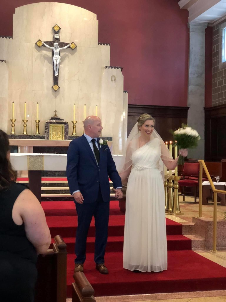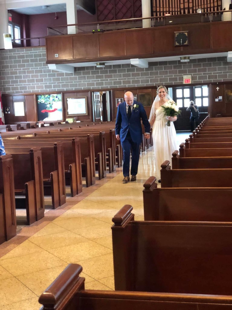 Making our way down the aisle with only the few front pews filled. We did the wedding our way, very small and intimate.