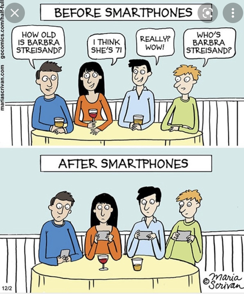 It is ridiculous! We cannot even be fully present to watch a tv show. I have my phone at the supper table and have received texts or an alert pops up on my phone and once again, I am distracted and not present for our evening meal.